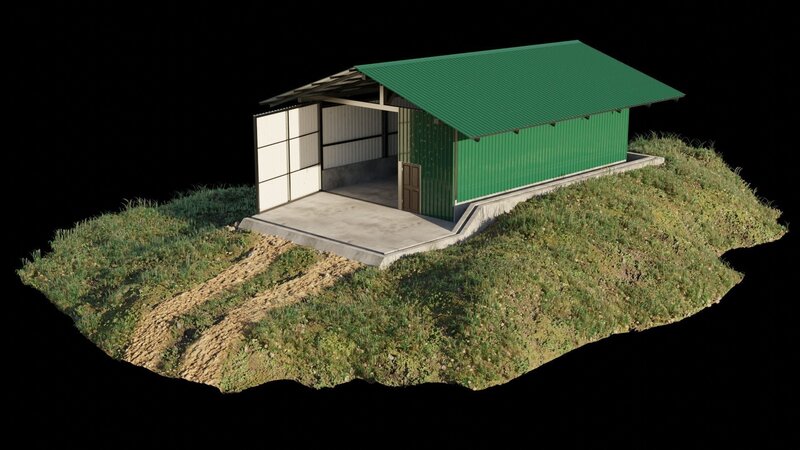 Metal profile shed or workshop for farms, scenery or other. One big metal door and one small wooden door to be opened or closed.